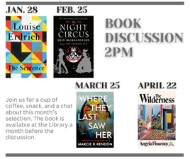 Join us at 2pm on a Wednesday for a cup of coffee, snack, and a chat about this month's selection. The book is available at the Library a month before the discussion.