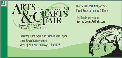 Celebrate creativity at the Spring Green Art Fair. Explore the works from over 180 artists-featuring pottery, paintings, jewelry, woodwork, and more! Enjoy live music, local food vendors, and fun for the whole family-all in one of Wisconsin's most charming small towns. Gift Cards for purchase are available at a few local businesses.